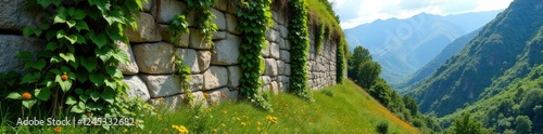 © Patchanee, Fototapeta premium Vines climbing up a rocky wall in the Adygea mountains, greenery, mountains, flowers