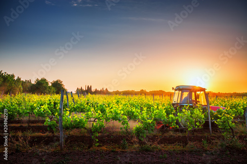 © ValentinValkov, Naklejka premium Vines on the field and a red tractor at sunset