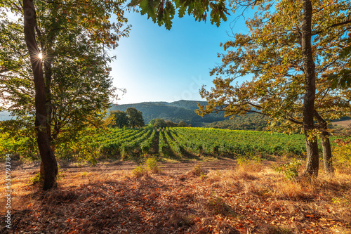 © ValentinValkov, Naklejka premium Vineyard agricultural fields in the countryside, beautiful landscape during sunrise.