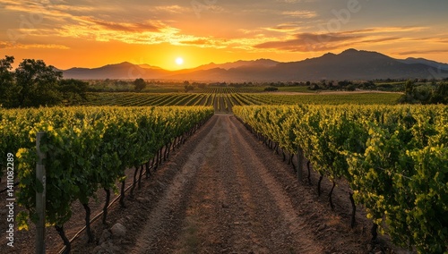 © qohhar, Naklejka premium Vineyard at sunset. Golden hour over rows of grapevines