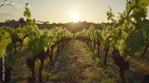 Naklejka premium Vineyard at Sunset Rows of Grapes and Golden Light