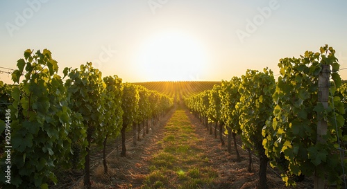 © syarif, Fototapeta premium Vineyard at Sunset Rows of Grapevines with Warm Sunlight and Sky
