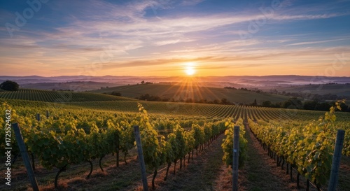 © aby.std, Naklejka premium Vineyard at sunset. Vast rows of grapevines stretch across a hillside, bathed in the golden light of a beautiful sunset