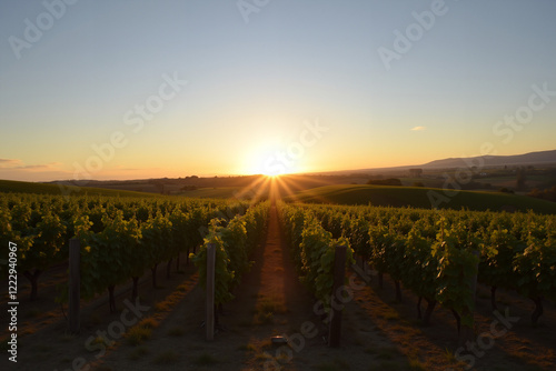 © Szabolcs, Naklejka premium Vineyard at sunset with rows of grapevines and long shadows