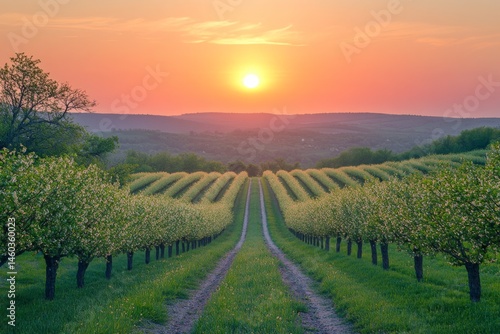 Fototapeta premium Vineyard at sunset with rows of grapevines under colorful sky