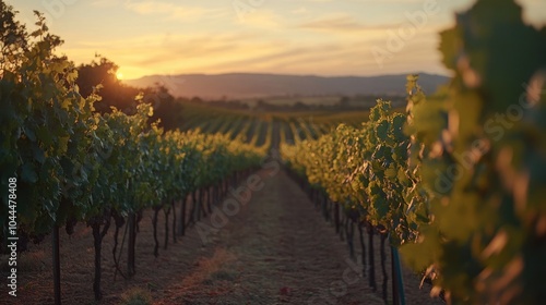 Naklejka premium Vineyard at sunset with rows of vines stretching toward the horizon, symbolizing the art, passion, and abundance of winemaking
