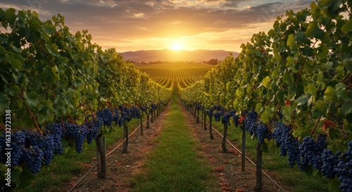 © ajib ajib, Fototapeta premium Vineyard bathed in golden light: Rows of grapevines under a picturesque sunset panorama