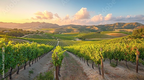 Fototapeta premium Vineyard landscape at golden hour, rolling hills, sunrise