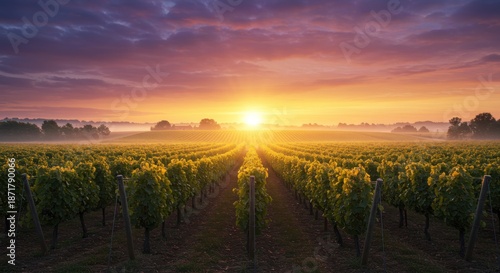 © Alleuy, Fototapeta premium Vineyard landscape at sunrise golden hour with sun rays and rows of grape vines