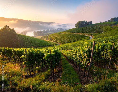 Fototapeta premium Vineyard landscape at sunrise with rolling hills