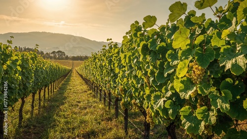 © Sona, Fototapeta premium Vineyard landscape during sunset with lush grapevines and distant hills. Agricultural and wine production concept. Nature and cultivation. The concept of viticulture and rural scenery