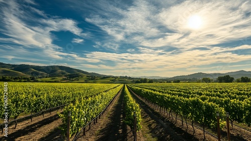 © utaem2022, Naklejka premium Vineyard landscape showing rows of grapevines growing under a bright sun