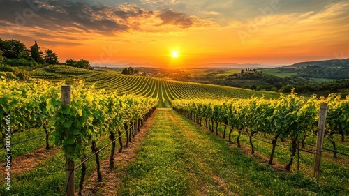 © Pixel Alchemist, Naklejka premium Vineyard landscape under sunset with rows of grapevines and rolling hills.
