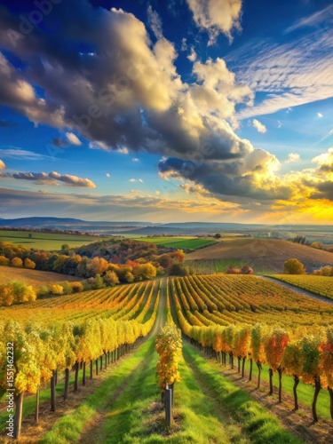 Fototapeta premium Vineyard landscape with beautiful clouds and blue sky in autumn