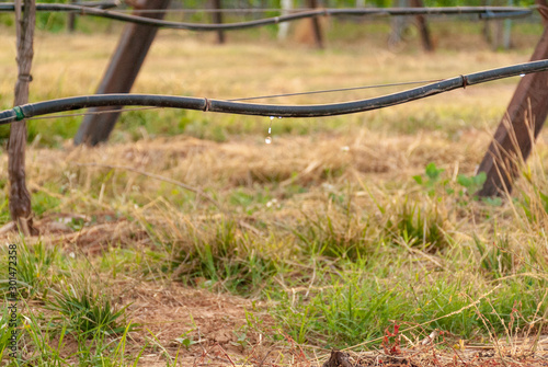 Fototapeta premium Vineyard landscape with irrigation system with drip of water, at sunset....