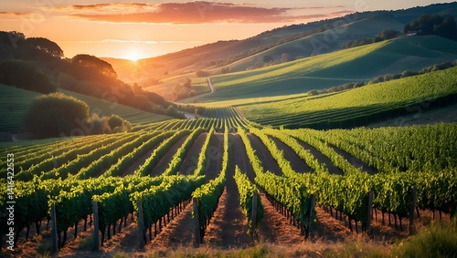 Fototapeta premium Vineyard landscape with rolling hills at sunset