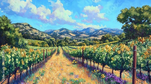 © Berkah1789, Fototapeta premium Vineyard Path Under Sunny Skies And Mountains