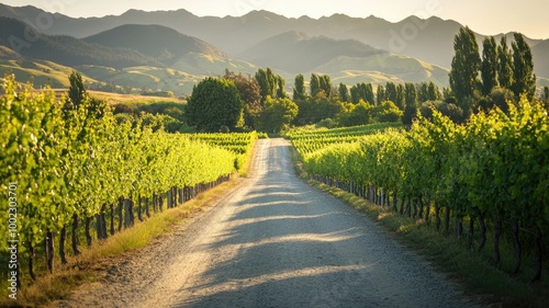 © Artyom, Naklejka premium Vineyard road under clear sky extends to mountains in distance