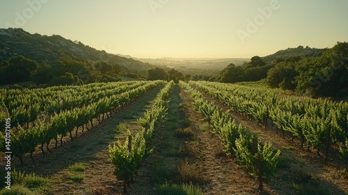 © waryati, Fototapeta premium Vineyard rows at sunrise