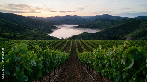 © Balaraw, Fototapeta premium Vineyard rows at sunrise over a misty lake
