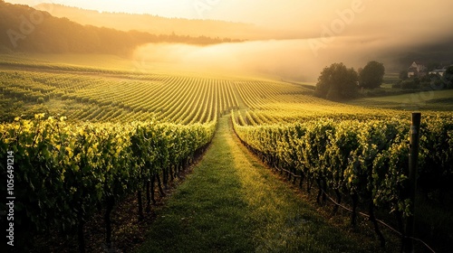 Fototapeta premium Vineyard Rows at Sunrise with Fog and Golden Light