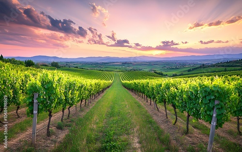 © DesignByGade, Naklejka premium Vineyard rows at sunset