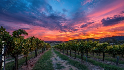 © AndiAzis, Obraz premium Vineyard rows at sunset scenic landscape