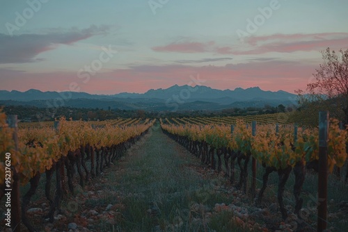 Naklejka premium Vineyard Rows at Sunset with Mountain Range in the Distance