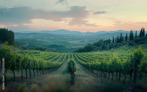 Obraz premium Vineyard rows at sunset with mountains in the distance