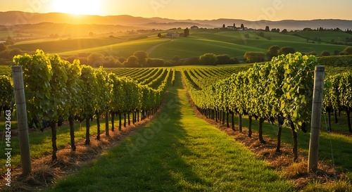 © SNACreatives, Fototapeta premium Vineyard Rows at Sunset with Rolling Hills and Distant Buildings
