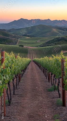 © milenialdesastudio, Obraz premium Vineyard rows lead to distant mountains at sunset. Serene landscape