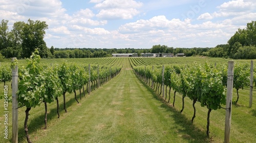 © Biancaart, Fototapeta premium Vineyard Rows Lead to Winery Building Under a Sunny Sky