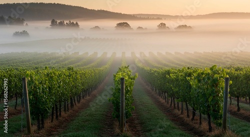 © Steffani, Fototapeta premium Vineyard rows stretch into the distance under a blanket of morning fog