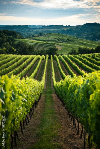 © Murda, Fototapeta premium Vineyard rows stretch into the distance under a cloudy sky.