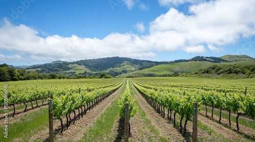 © Lesuna, Fototapeta premium Vineyard Rows Stretch to Hills Under Clear Sky