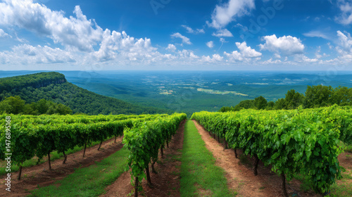 Naklejka premium Vineyard rows stretch toward a distant mountain vista under a vibrant blue sky with puffy white clouds on a sunny day, showing the beauty of nature.