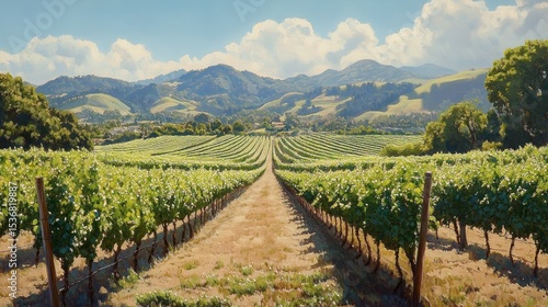 Naklejka premium Vineyard Rows Stretch Towards Mountains