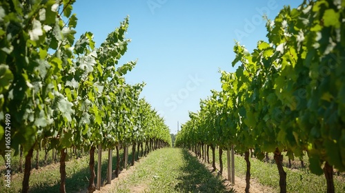 Naklejka premium Vineyard rows under a bright sunny day, cultivation and idyllic countryside