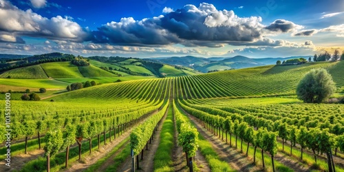 © BrilliantPixels, Fototapeta premium Vineyard Rows Under Dramatic Sky, Landscape, Rural , vineyard