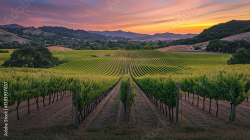 Naklejka premium Vineyard rows, wide-angle drone view, summer evening, green vineyards in...