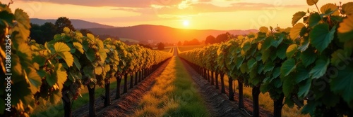 © Prasert, Naklejka premium Vineyard rows with ripening grapes under autumn sky, row, countryside