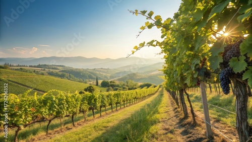 Fototapeta premium Vineyard's Sunlit Rows: Gaze upon a picturesque vineyard with sun-drenched grapevines stretching towards a horizon of rolling hills and a bright blue sky.