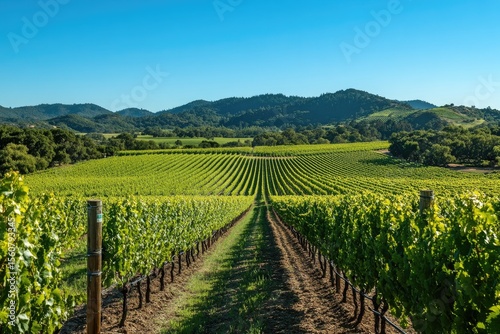 © Adriyanca, Fototapeta premium Vineyard stretching to a distant mountain range under a clear blue sky