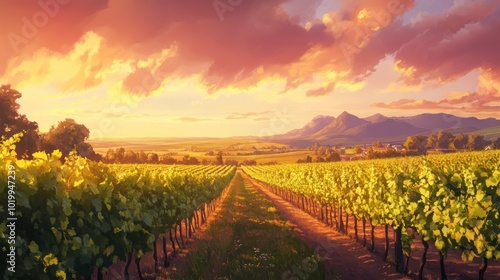 © warunthorn, Fototapeta premium Vineyard Sunset.