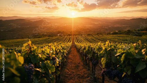 Fototapeta premium Vineyard sunset golden hour rows grapes wine country landscape