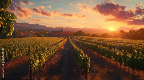 © Jiranath, Fototapeta premium Vineyard Sunset Landscape
