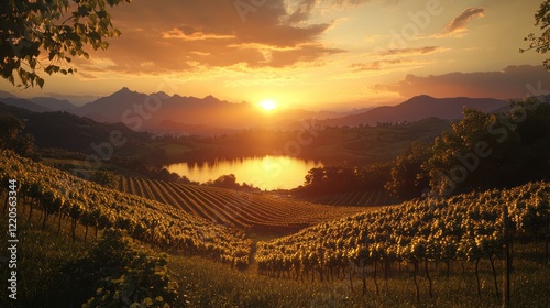 Fototapeta premium Vineyard sunset landscape, lake, mountains, idyllic, tourism
