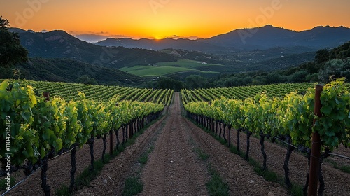 Fototapeta premium Vineyard sunset landscape. Rows of grapevines lead to a stunning sunset over rolling hills.