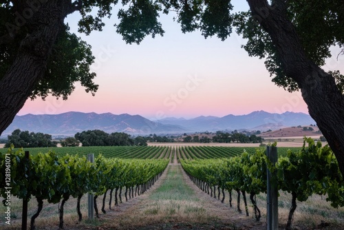 © Syarif, Obraz premium Vineyard sunset landscape with mountains. (3)
