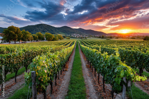 Fototapeta premium Vineyard Sunset Over Rolling Hills and Distant Village